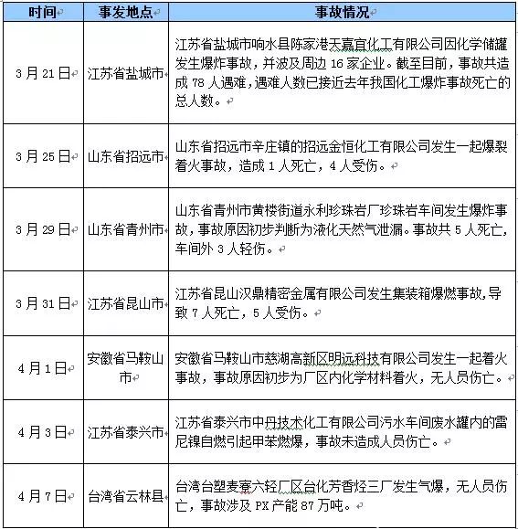 “3·21”特別重大爆炸事故發(fā)生以后,安全事故并沒有由此停歇,并再度頻繁上演。接連的爆炸事件引起政府和群眾的高度重視,事故發(fā)生后全國在化工領(lǐng)域開展;访芗脚挪,化工行業(yè)整治力度再上臺階。作為本輪事故多發(fā)地的江蘇省,亦于4月1日出臺史上最嚴(yán)的整治方案:要求到2020年底,江蘇省化工生產(chǎn)企業(yè)數(shù)量減少到2000家,到2022年,全省化工生產(chǎn)企業(yè)數(shù)量不超過1000家。4月5日,江蘇鹽城決定徹底關(guān)閉響水化工園區(qū),鹽城這一舉措,外界認(rèn)為無疑于是“壯士斷腕”。