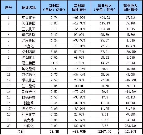 上市公司2019年度的半年報已披露完畢。廣東塑料交易所統(tǒng)計(jì)了新疆天業(yè)、中泰化學(xué)、英力特、鴻達(dá)興業(yè)等20家氯堿行業(yè)上市公司上半年的業(yè)績情況,合計(jì)實(shí)現(xiàn)營收1247.66億元,同比增長12.96%,凈利潤52.38億元,同比下降27.93%;雖然利潤出現(xiàn)下滑,但上半年這20家上市公司全部實(shí)現(xiàn)盈利。