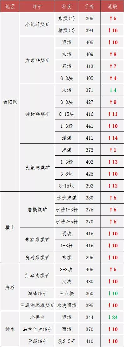 據(jù)榆林煤炭交易中心數(shù)據(jù)顯示,現(xiàn)在榆陽區(qū)(6000K 0.6S)標(biāo)準(zhǔn)煤均價已漲至399元/噸,神木(5800K 0.4S)標(biāo)準(zhǔn)煤均價漲至385元/噸,府谷(5500K 0.4S)標(biāo)準(zhǔn)煤均價漲至355元/噸。